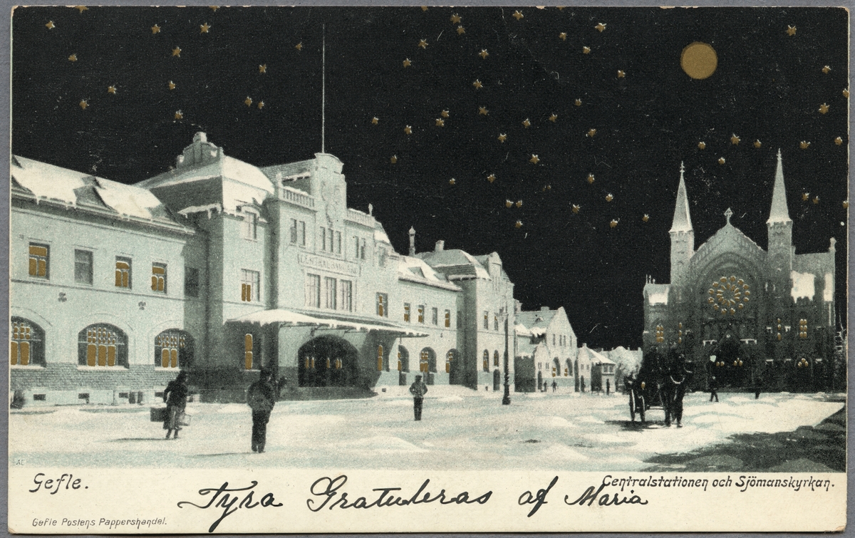 Titel: Centralstationen och Sjömanskyrkan vid Centralplan i Gävle.