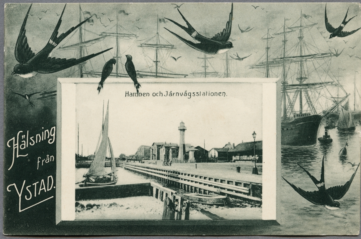 Titel: Ystads hamn med järnvägsstationen i bakgrunden.