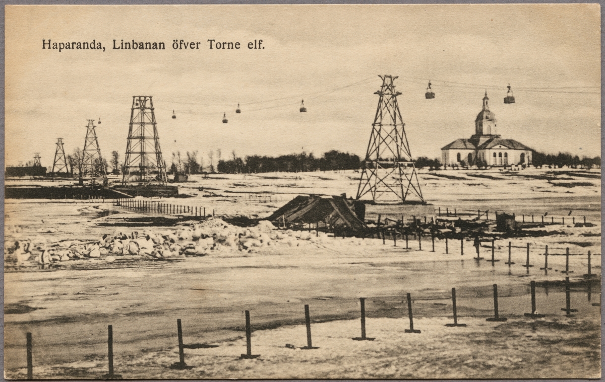 Postlinbanan över Torneälven mellan Haparanda och Torneå 1916-1918. Torneå kyrka syns på bilden.