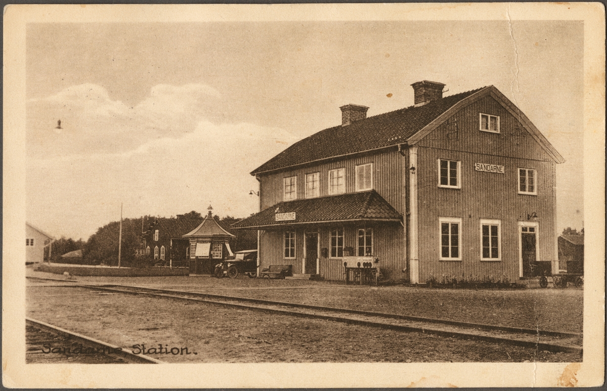 Titel: Spårsida av station med vy på stationshus.