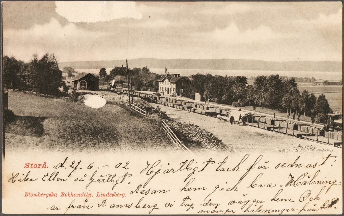 Titel: Vy på stationsområde med godsvagnar och Råsvalen sjön i bakgrunden.