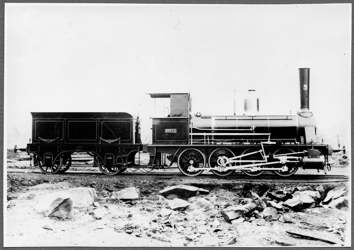Leveransfoto, Skåne Halands Järnväg, SHJ lok 3 "Rögla", tillverkat 1883 av Nohab. 1896 såldes loket till Statens Järnvägar och fick littera SJ VKBh 500. Det skrotades 1906.