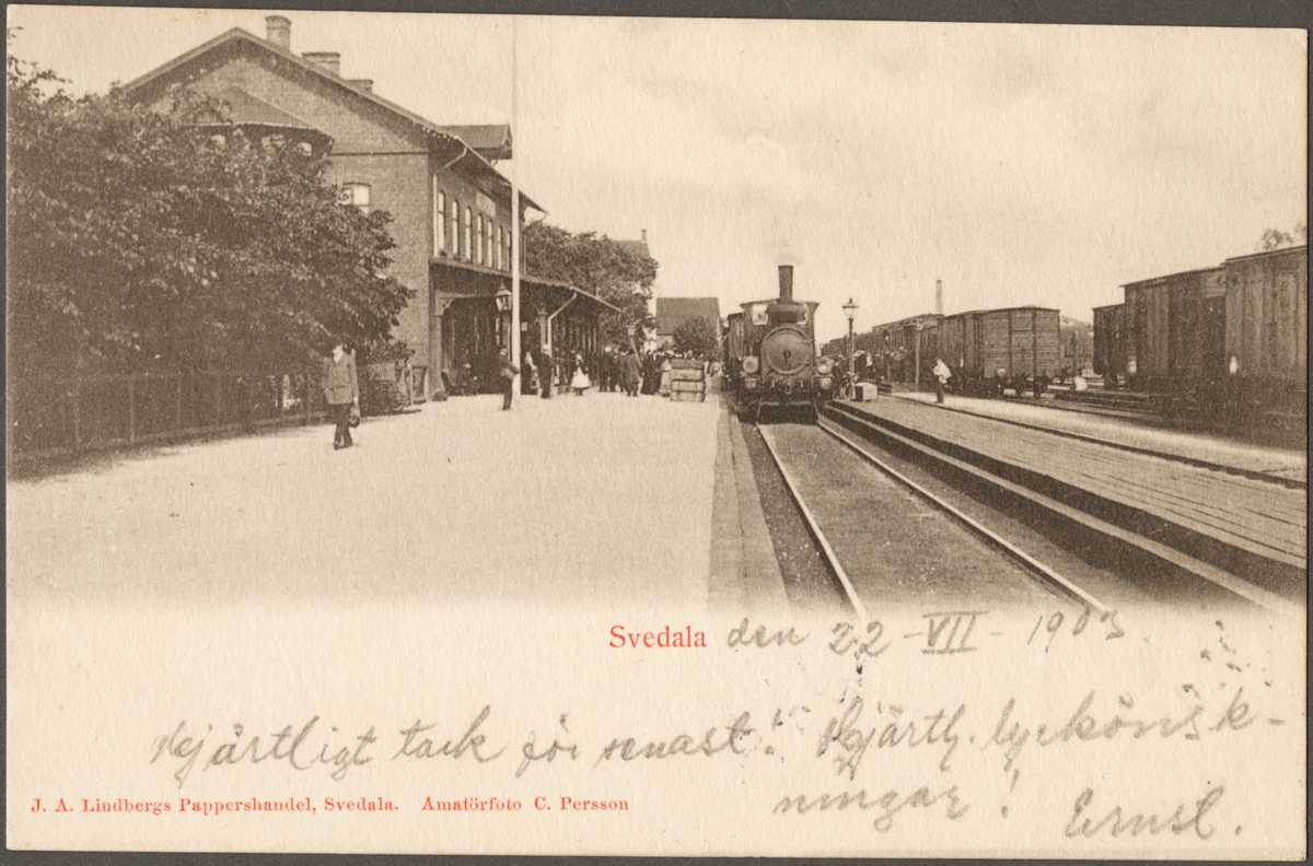 Spårsida av station med resande och bangård.