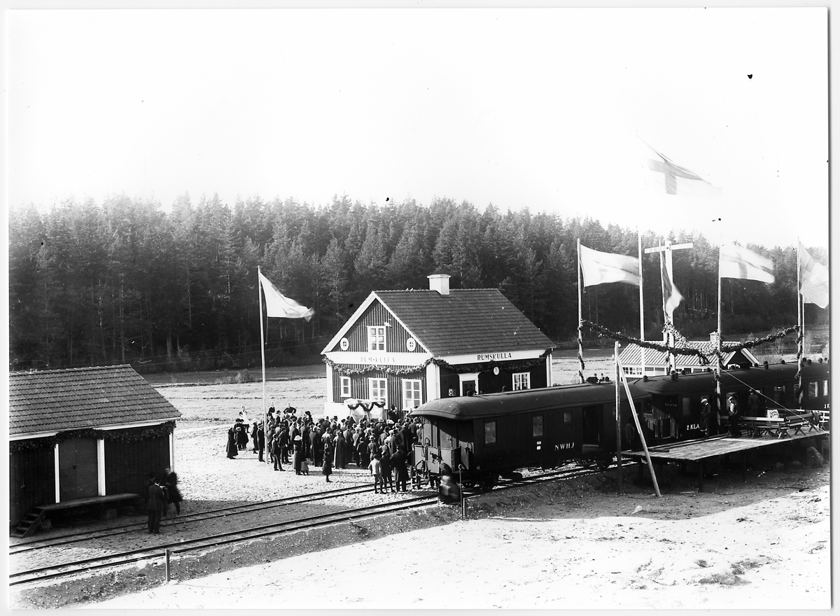 Titel: Invigning av Vimmerby - Ydre Järnväg vid Rumskulla station. Invigningen var den 10 oktober.