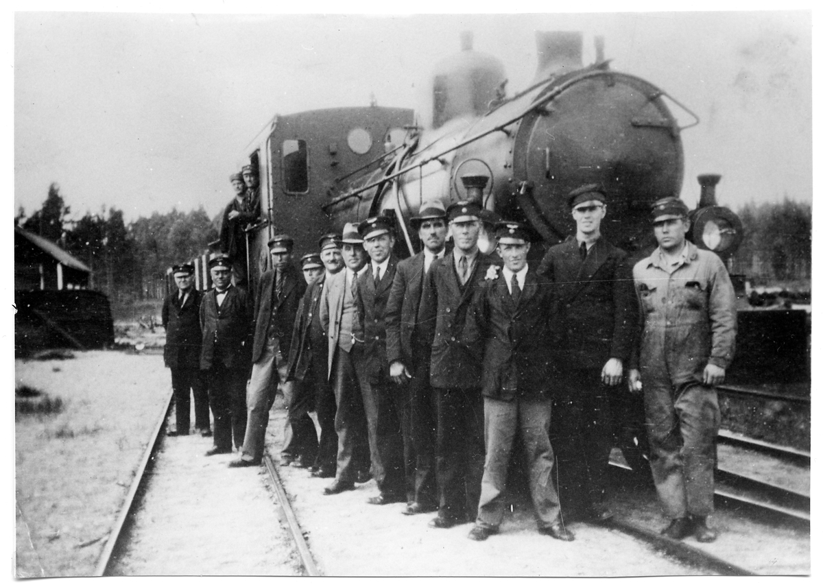 Tågpersonal framför ånglok. Norsholm Västervik Hultsfred Järnvägar, NVHJ lok 25.