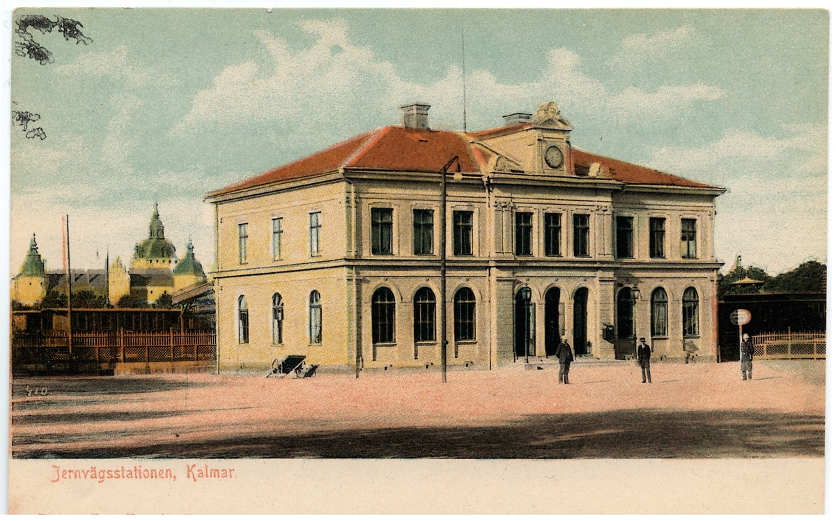 Titel: Kalmar station från gatusidan runt sekelskiftet. Kalmar slott i bakgrunden.