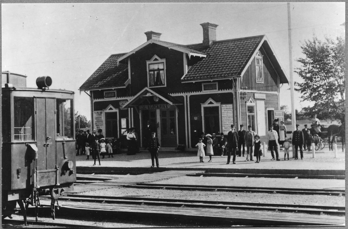 Mellersta Östergötlands järnvägar, MÖJ, Klockrike station. Fronten på elmotorvagn "Ankan" syns.