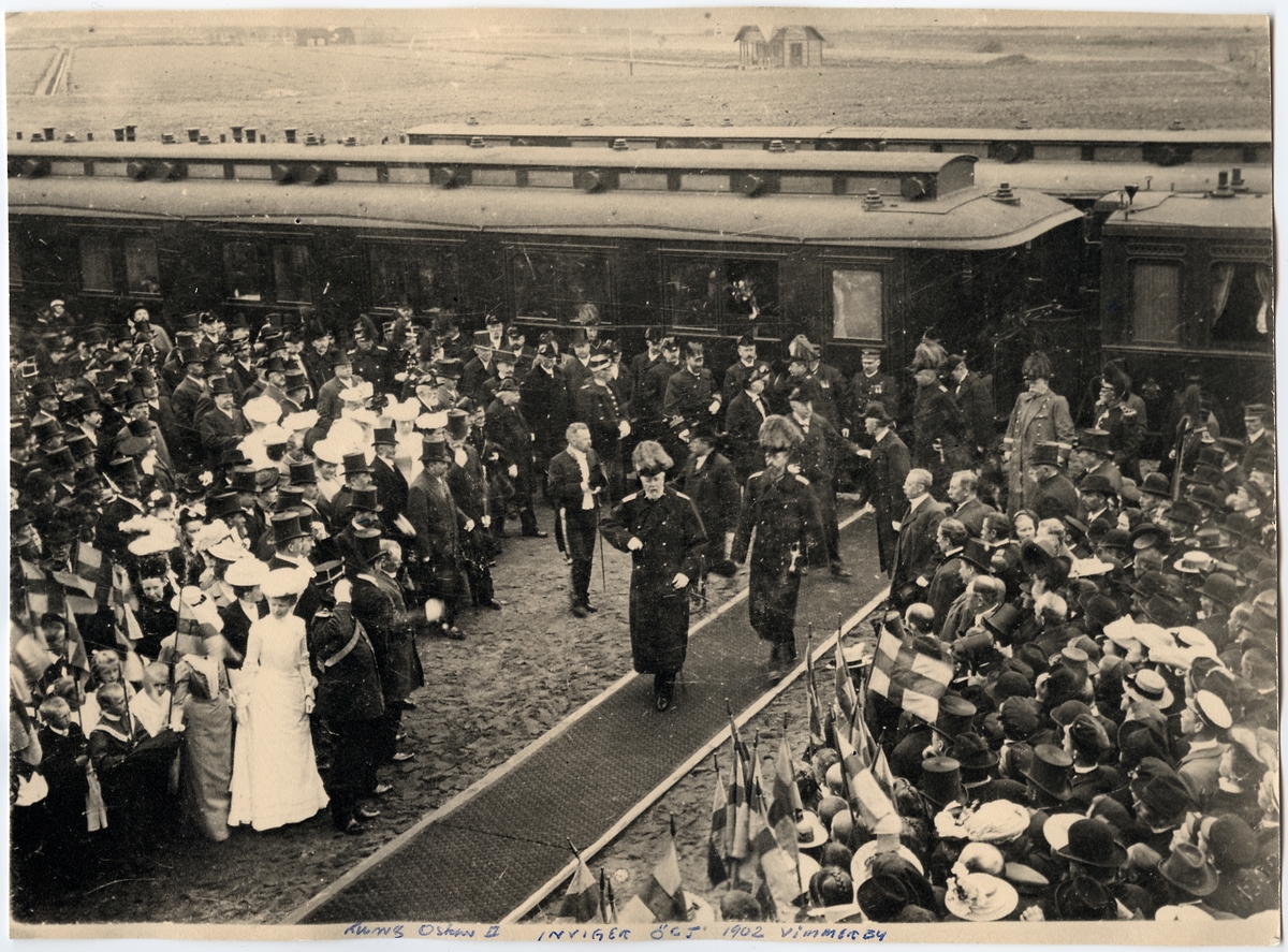 Invigning av Östra Centralbanans Järnvägar, ÖCJ vid Vimmerby station. Kungen Oskar den II tillsammans med kronprinsen Gustav V på besöket.