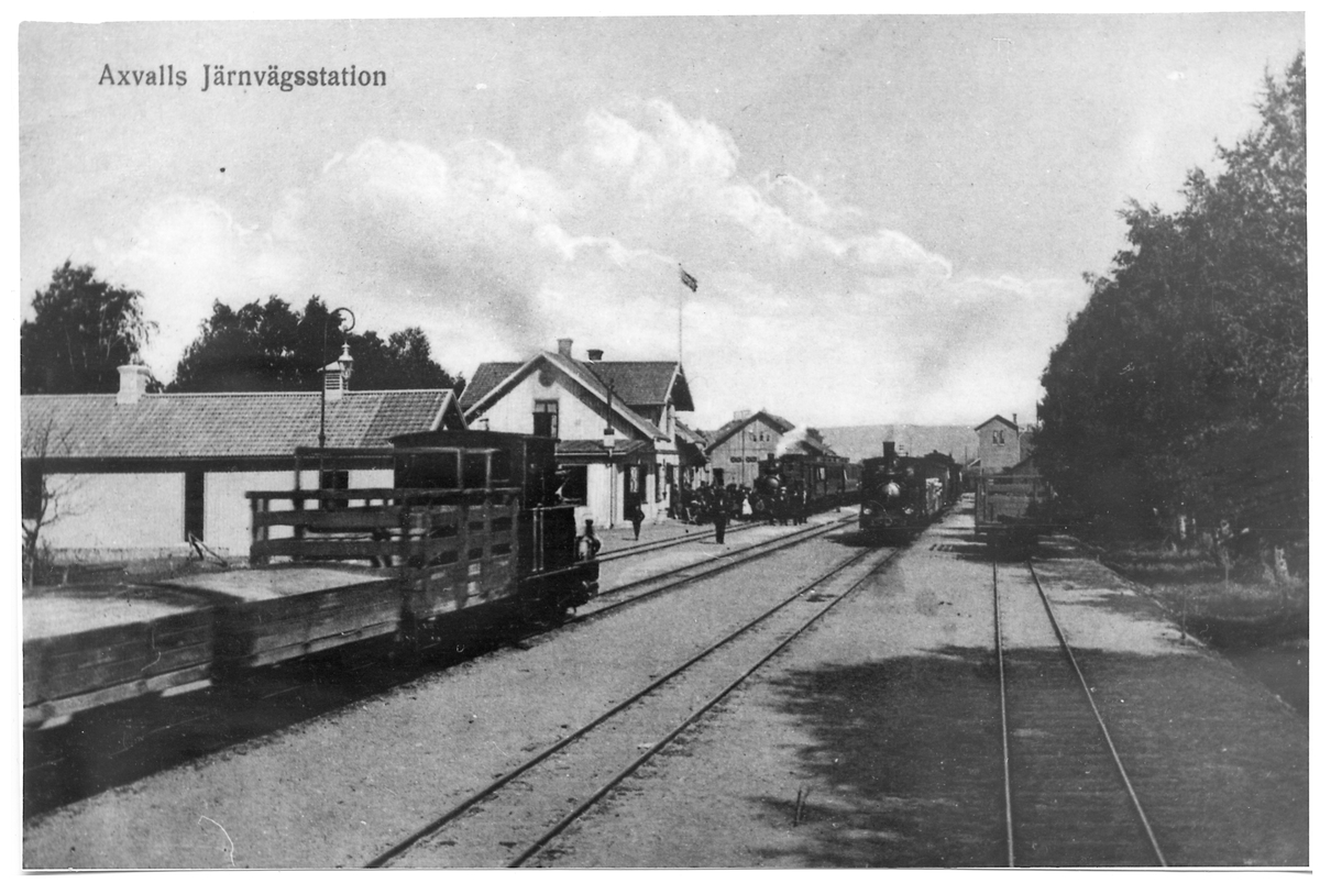 Skövde-Axvalls Järnväg, SAJ lok 2 "Varnhem" möter ett godståg vid Axvalls järnvägsstation i början av 1900-talet.