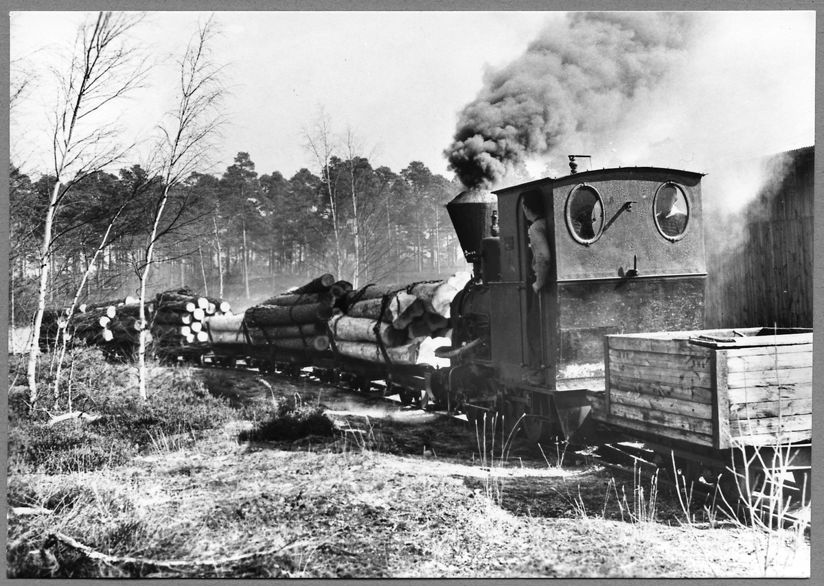 Domänverket Böda lok 1 "Mormor" med sju koppel timmer. Bödabanan, Böda kronopark.