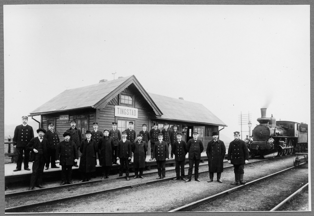 Tingstad station med personal uppställd inför stationshuset. Statens Järnvägar, SJ VKBg 496.
