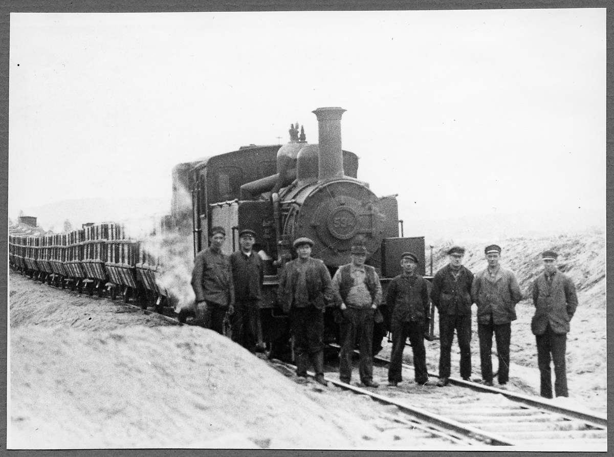 Personal och banarbetare uppställda framför ångloket, Statens Järnvägar, SJ U 594.