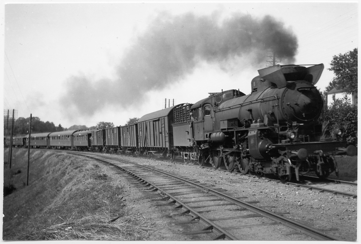 Blandat tåg lämnar Växjö mot Emmaboda. Draget av Statens Järnvägar, SJ B 1034 med vedeldning.