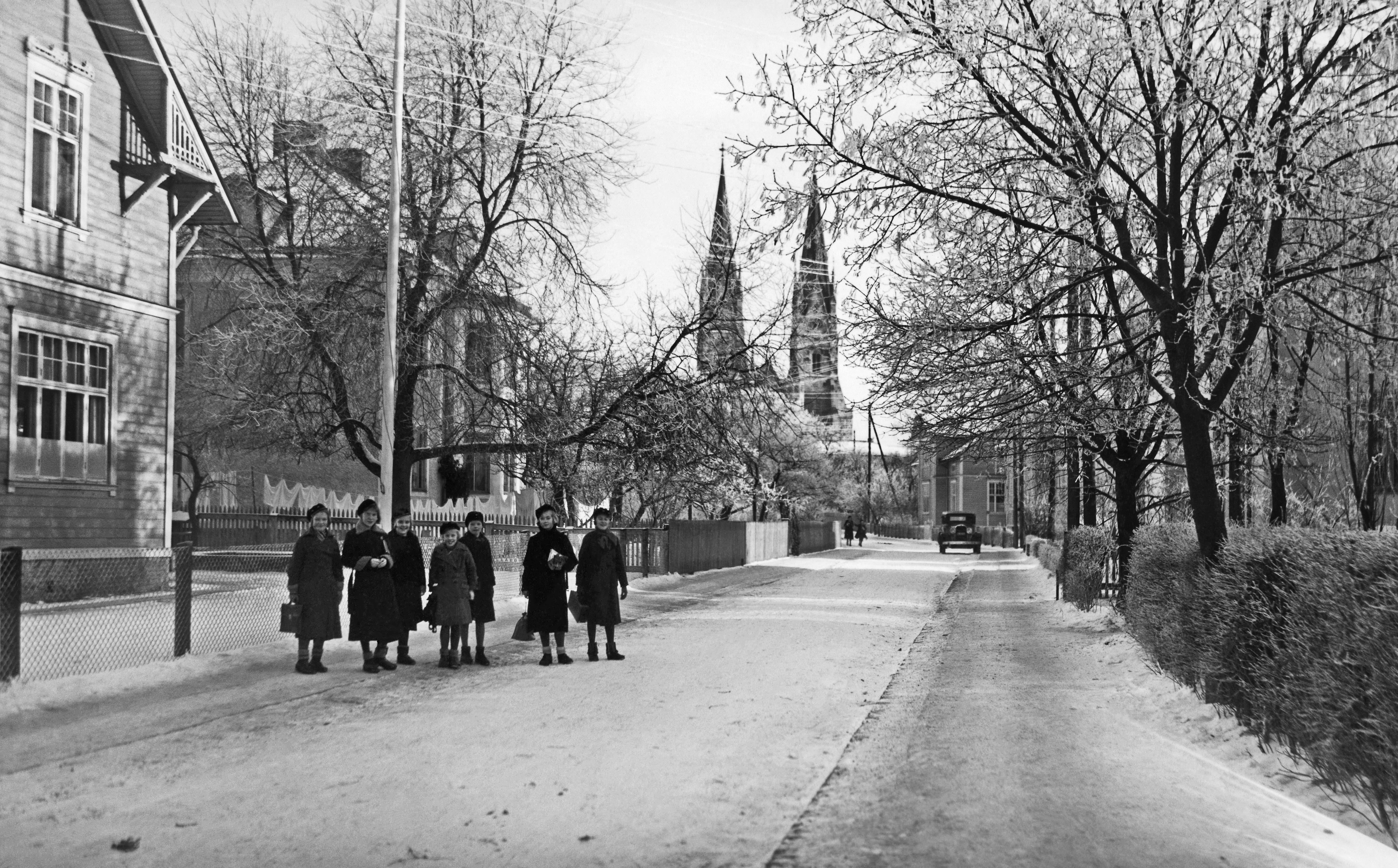 Skolflickor på Alandersgatan. Vy mot Skara domkyrka. Vykort.