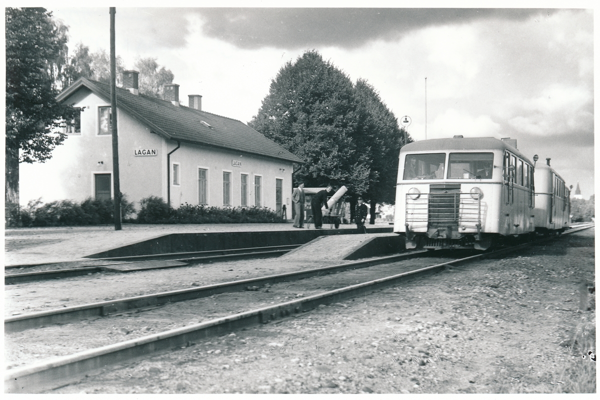 Titel: Vykort utgivet av Preesbyrån. Nr 20414. Hilding Karlsson rälsbuss på stationen.