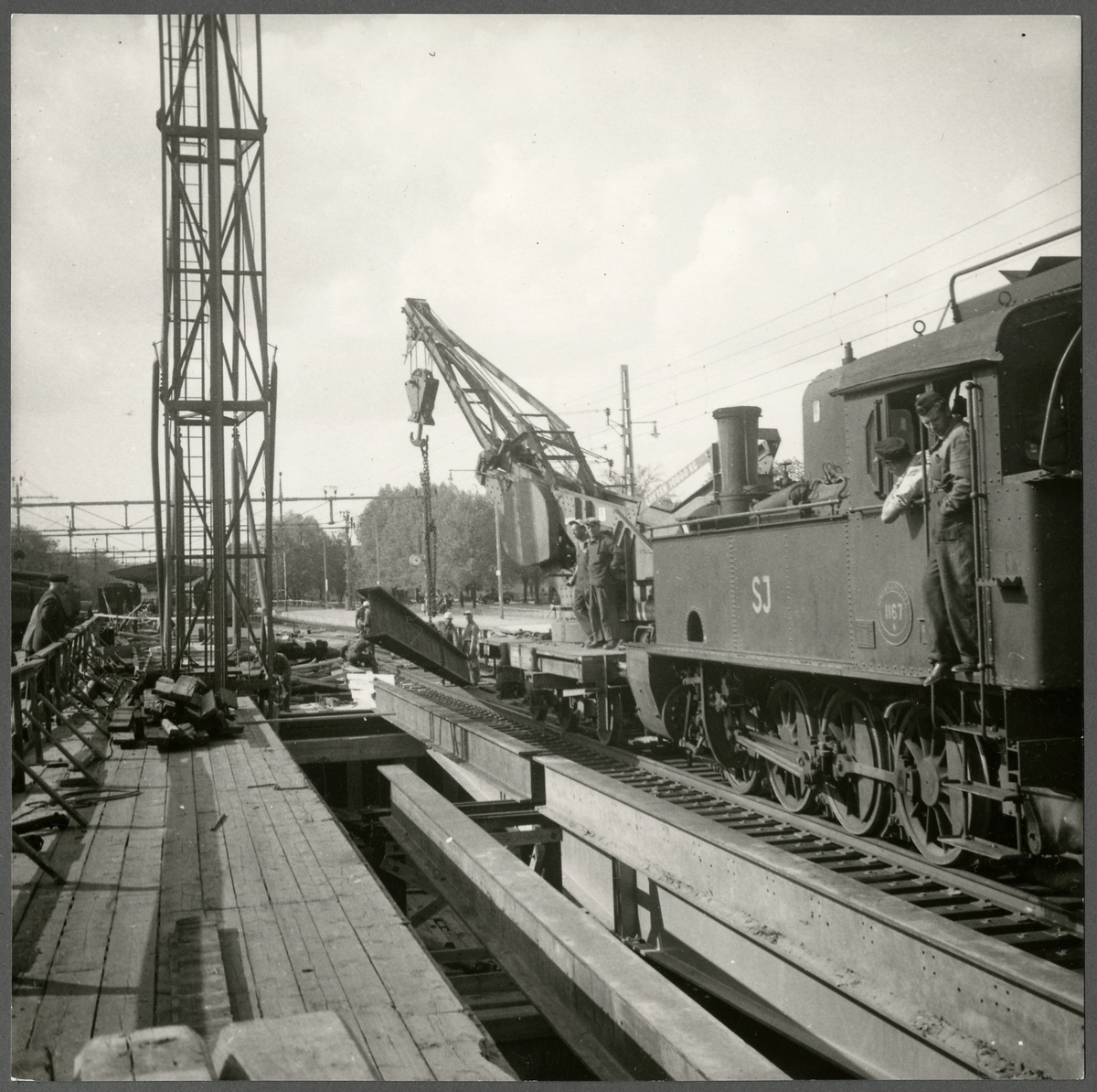 Gävle, brobygge över Gavleån 1955-1957 där Statens Järnvägar, SJ N 1167 står på spåret.
