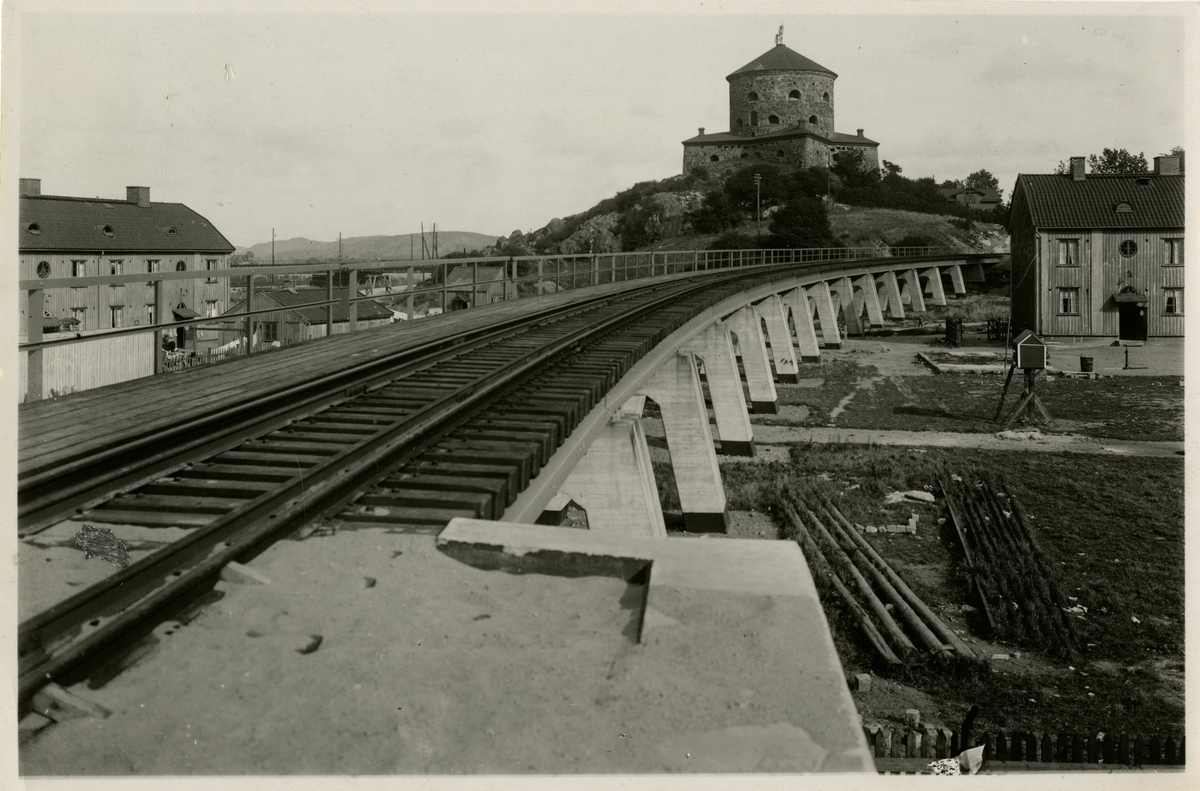 Titel: Nya viadukten för Västkustö Borås banorna. Skansen Lejonet i bakgrunden.