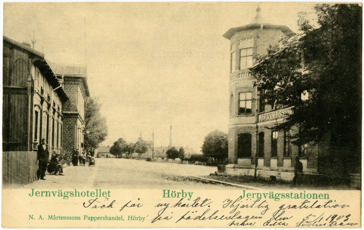 Stationen och järnvägshotellet i Hörby. Män, kvinnor och barn utanför järnvägsstationen.