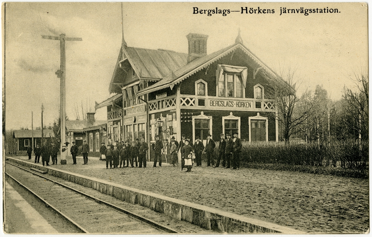 Titel: Vykort med texten Bergslags- Hörkens järnvägsstation. Efter 1907 bytte stationen namn till Hörken.