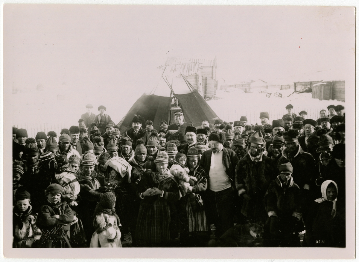 Text på baksidan av fotot. "Lappmöte i Jukkasjärvi 1905, Främst synes Hjalmar Lundbohm"