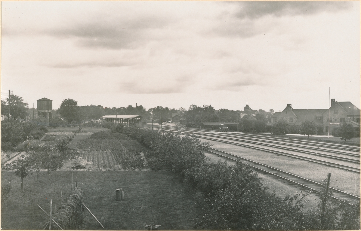 Titel: Statiobnsbyggnad. bangård och vattentorn