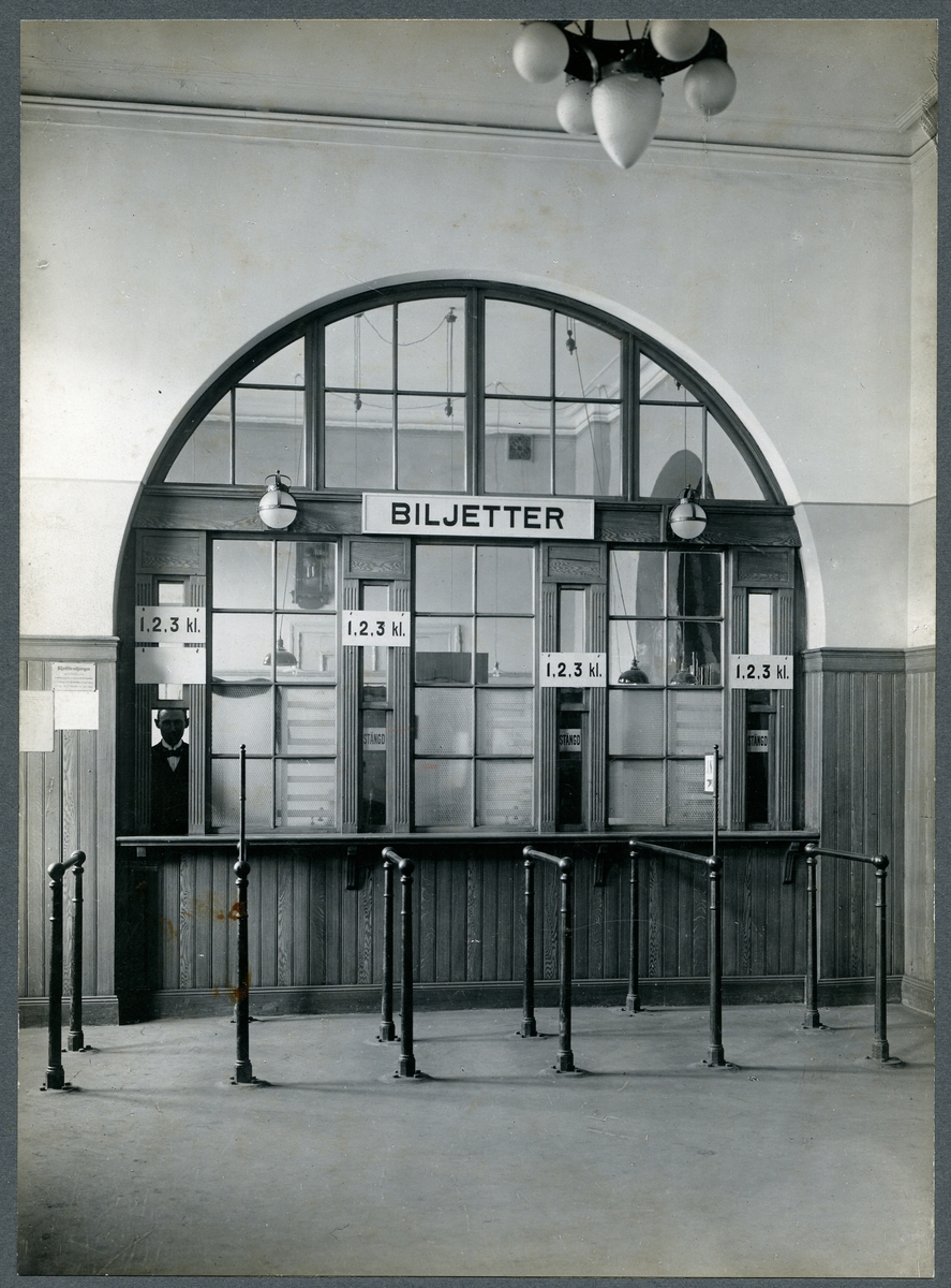 Titel: Malmö nya stationshus. 3:e klass väntsal med parti av biljettluckor.