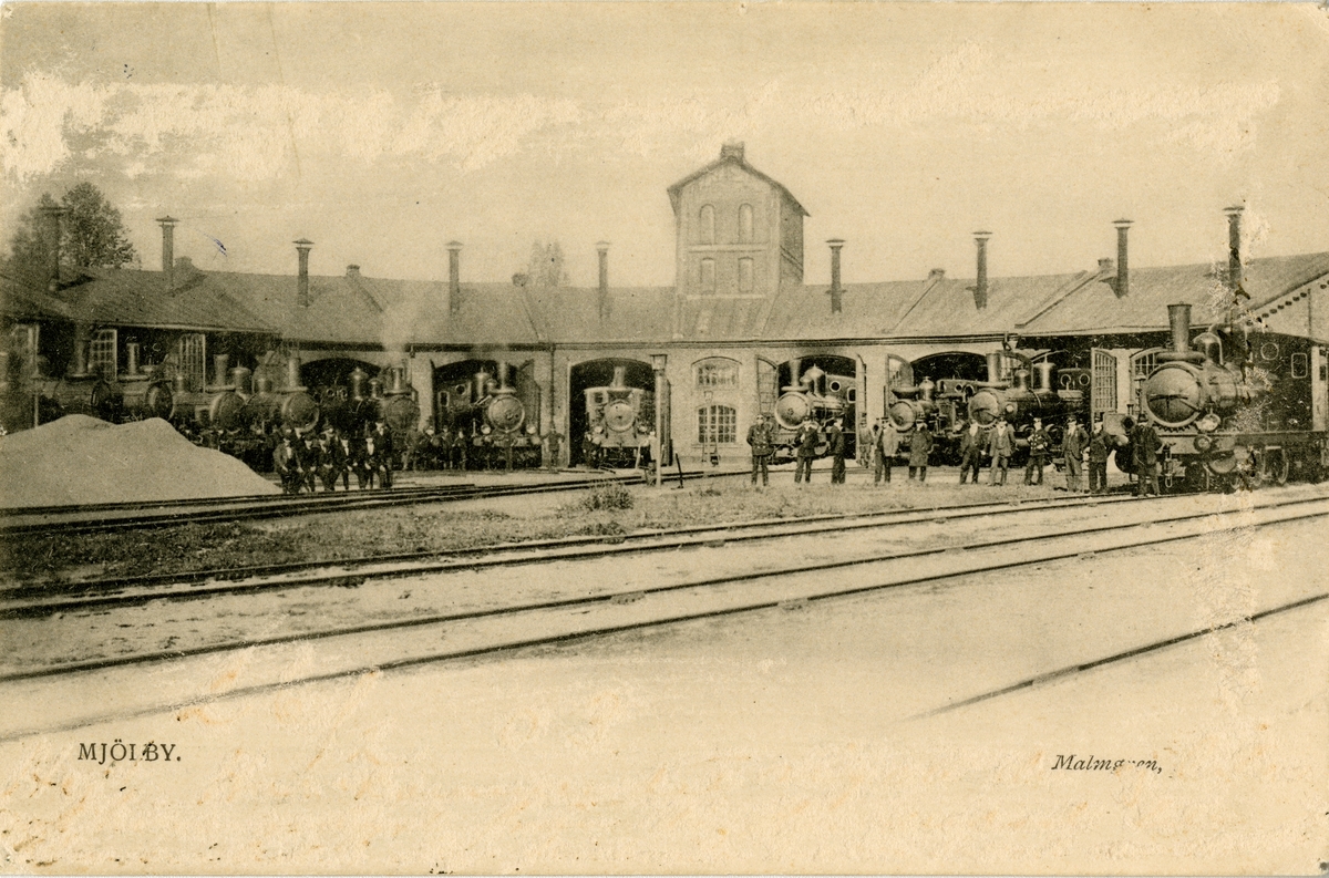 Titel: Mjölby lokstall Vykortet stämplat 1903