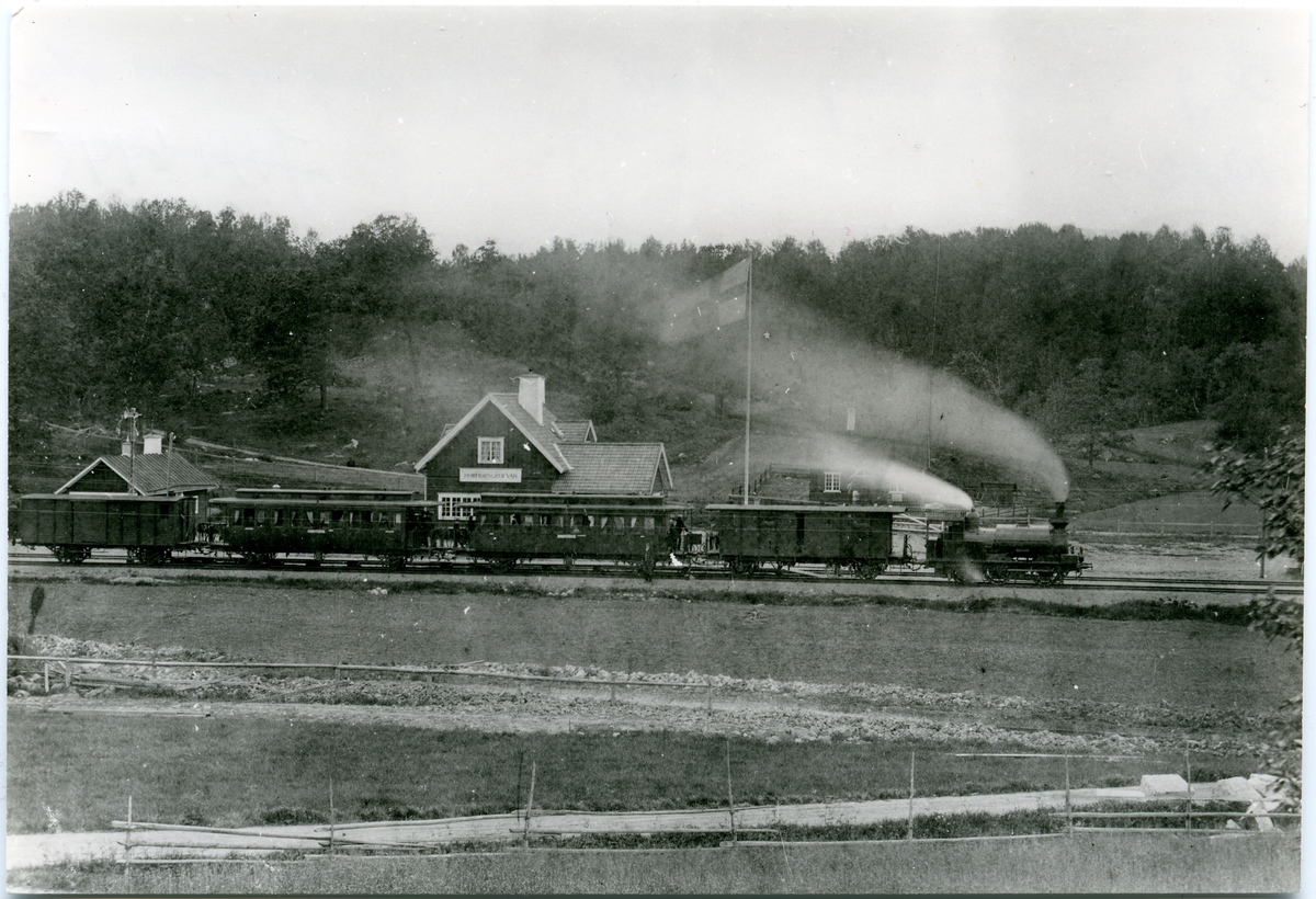Sadeltankslok drar person och godsvagnar. Datering på kortet 1902 men troligen efter 1905 eftersom flaggan inte har unionssymbol. Sverige Norge union till 1905.