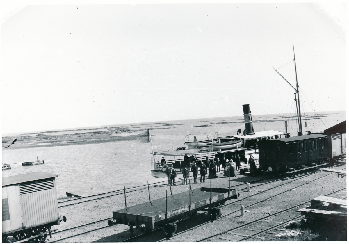 Titel: Sunnanå hamn vid Vänern. Omstigning mellan tåg och båt. Ångbåten är "Kinnekulle af Råbäck".