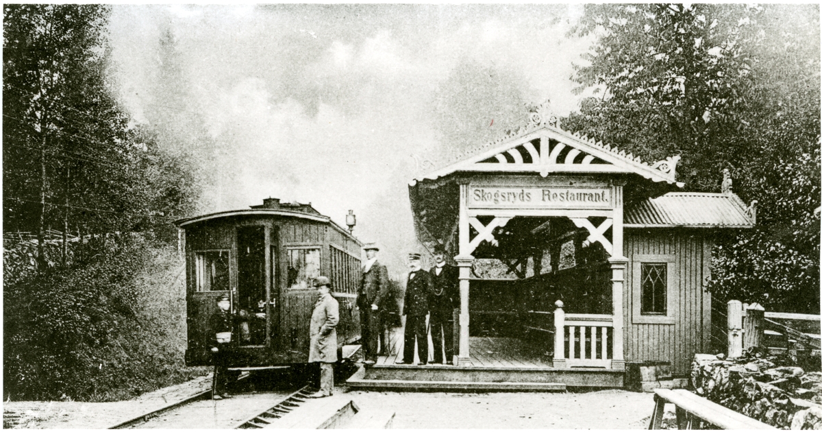 Skogsryds station restaurang 1903. På kopia av bilden står texten - Borås järnvägar, Ångvagnen vid skogsryd. Tillverkad 1982 för Oxelösund - Flen - Västmanlands Järnväg, OFWJ. 1902 till Varberg - Borås Järnväg, WBJ.