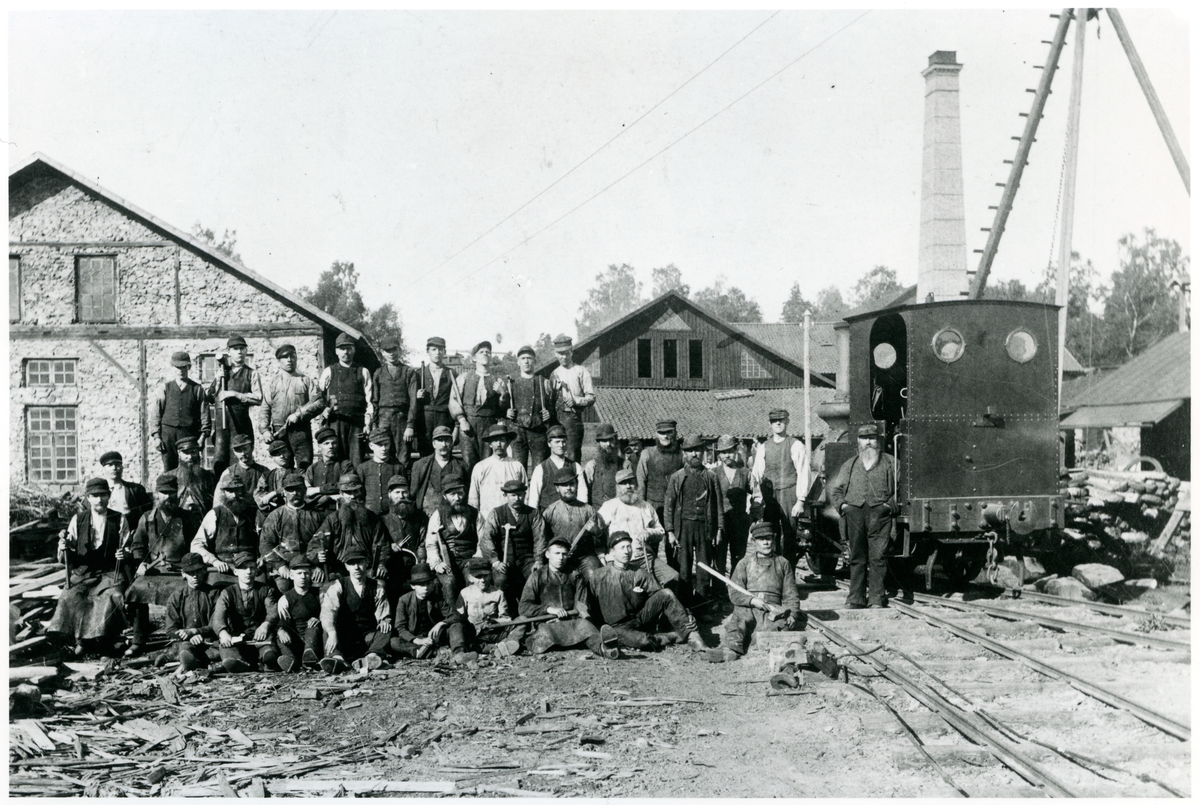 Spikfabriken Skyllbergs bruk 1890. Personalen har ställt upp sig för fotografering. Loket är nummer 1 "KÅRBERG".