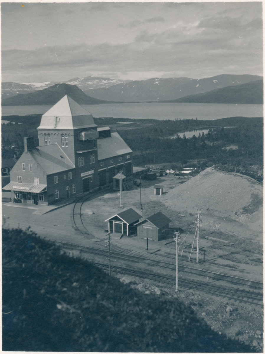 Statens Järnvägar, SJ, 393 meter över havet,1464 km från Stockholm, OBS pågående arbete för beklädnad av markvegitation av slänten och plant, där framför.