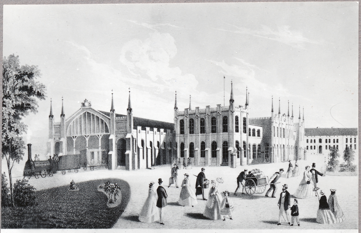 Titel: Stationshuset vid bangården i Göteborg. Litografi år 1857