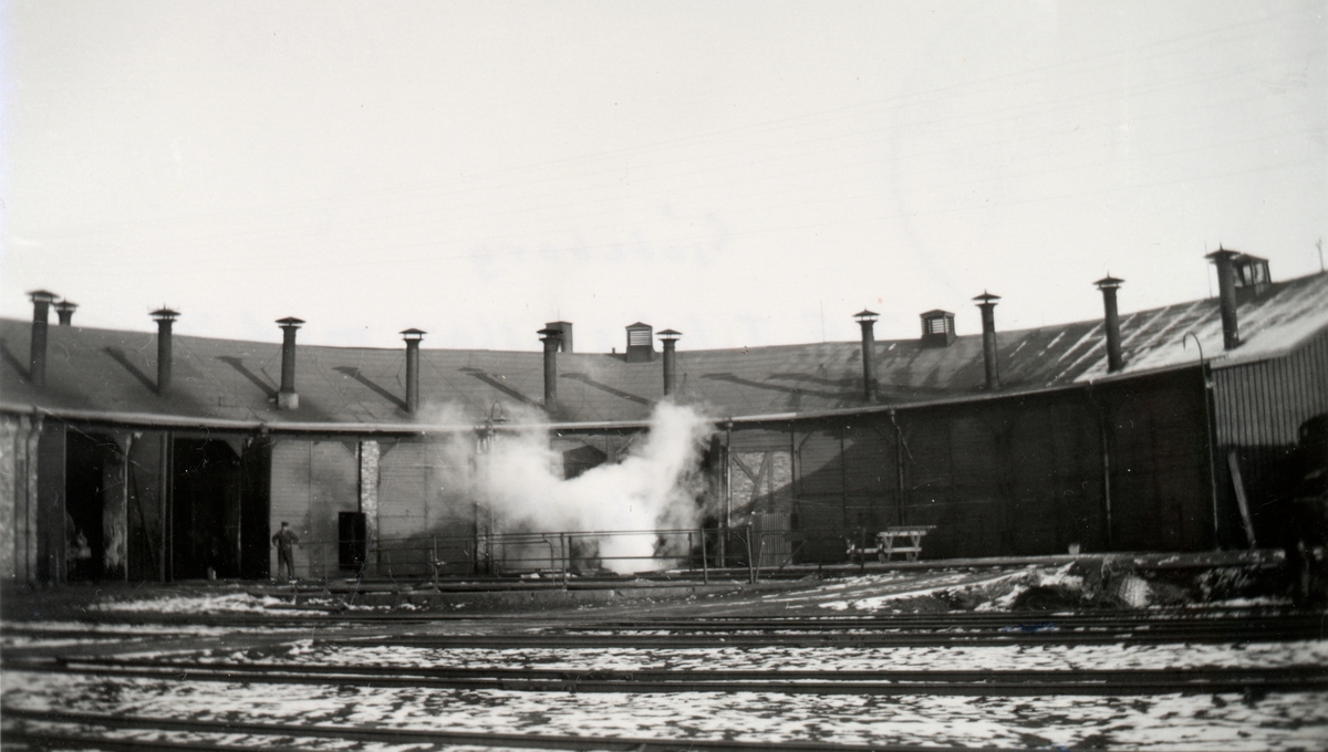 VGJ, Västergötland-Göteborgs Järnvägar, lokstallar med vändskivan i förgrunden. Rangerbangård Marieholm.