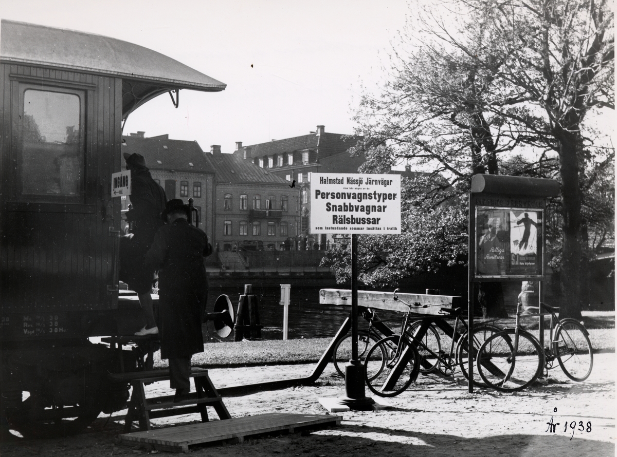 Demonstration av person- och motorvagnar på spåret vid Österbro i Halmstad. Som instundande sommar insätts i trafik.