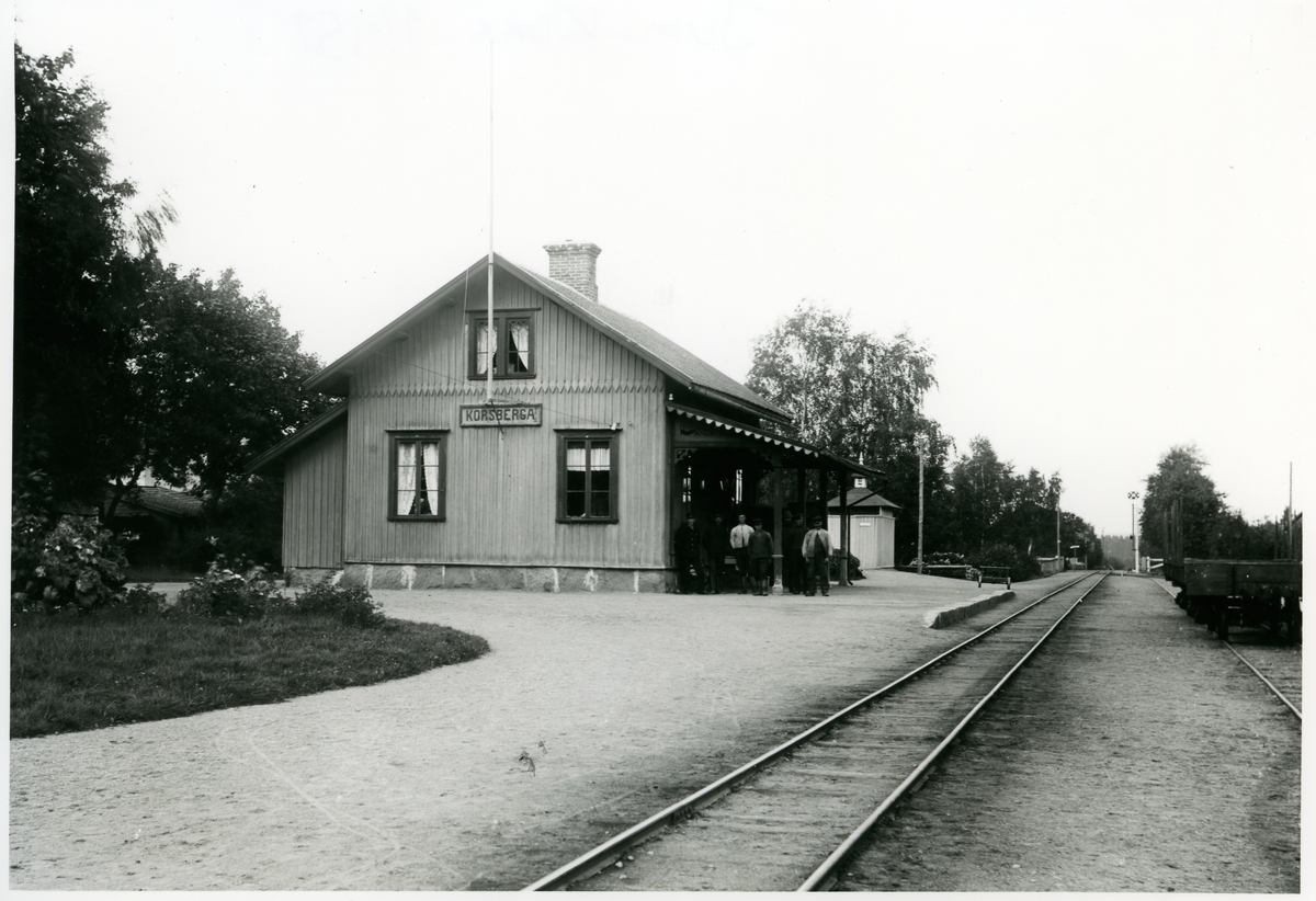 Korsberga station med stationspersonal. Den lilla byggnaden med tornet är avträdet.