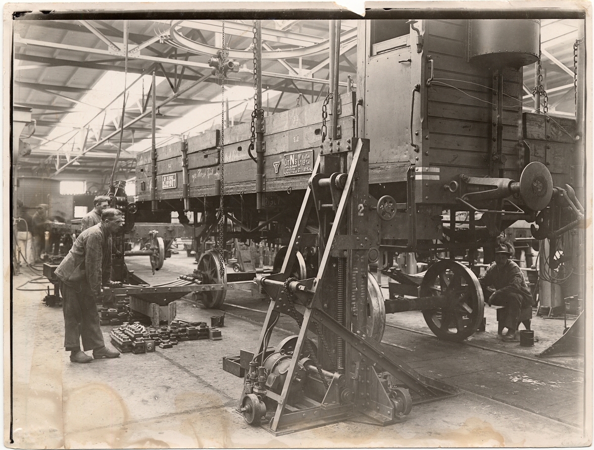 Titel: Fjädermontering i samband med axelmontering på Liljeholmens Verkstad. Vagnslyft.