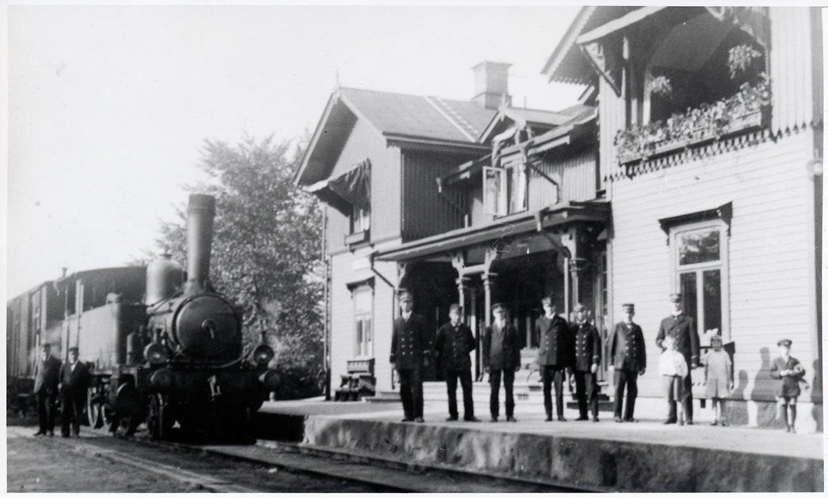 Titel: Strängnäs station med personal och (NrSlJ) Norra Södermanlands Järnvägs ångtåg.