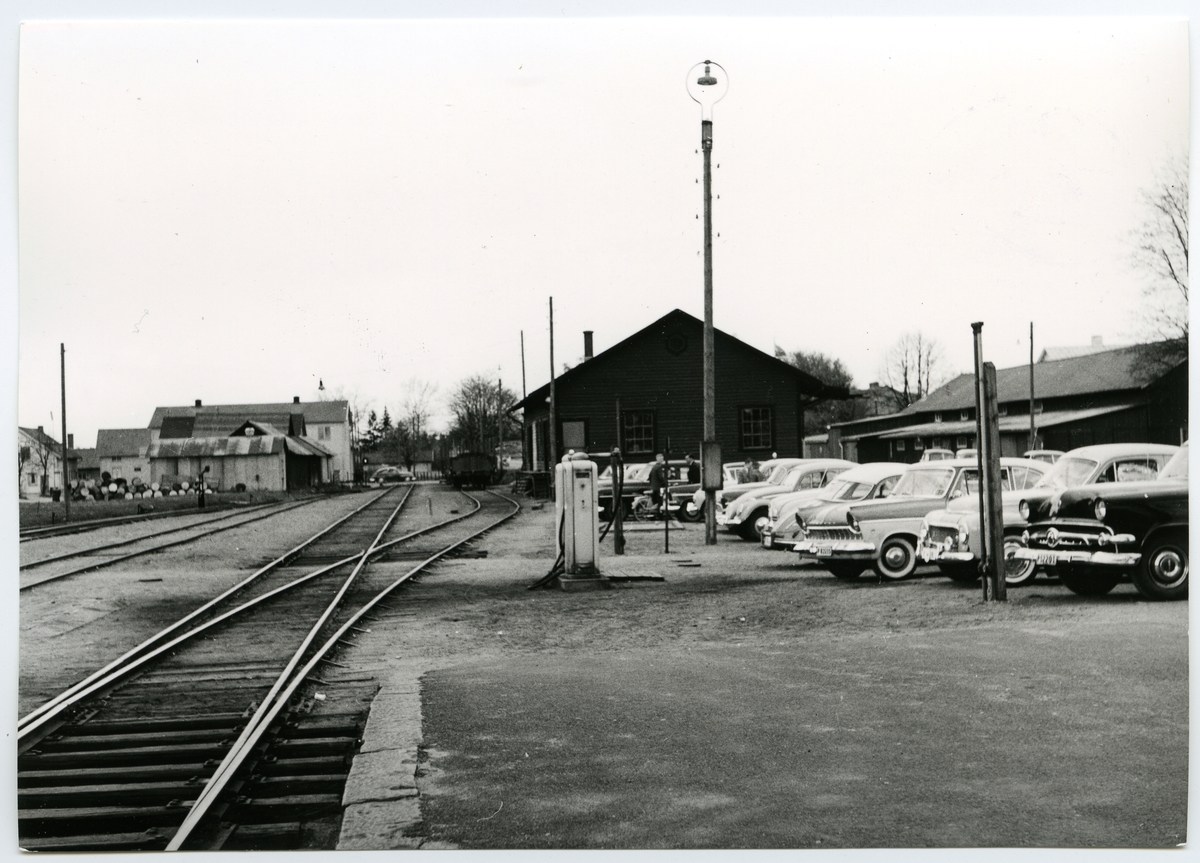 Nedläggning av bandelen Älvsered - Axelfor s- Hillared 1961-05-01 (delvis nedläggning 1959-11-19). Svenljunga bangård, norra infarten från Borås med godsmagasinet.