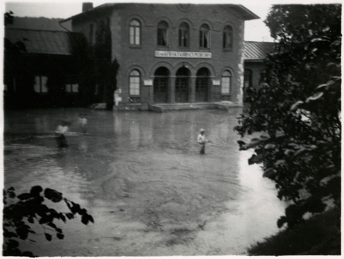 Titel: Översvämning invid stationshuset Södertälje 1925 efter ett häftigt regn.