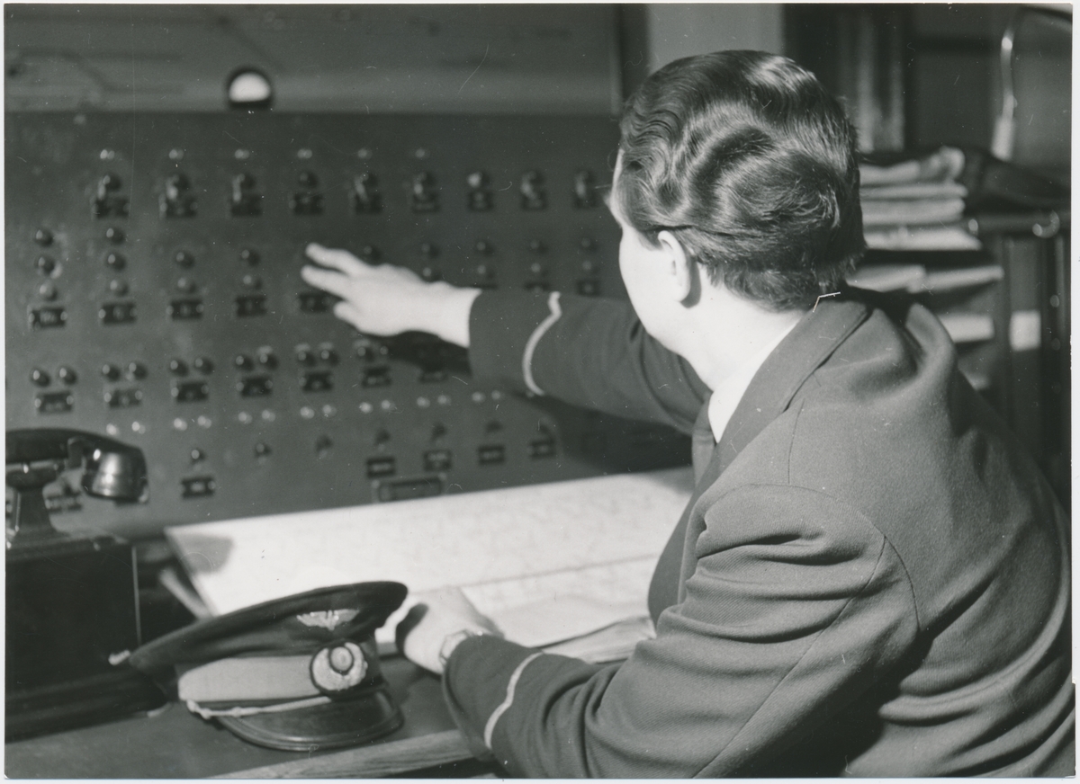 SRJ. Stins L. Hallin vid knappställverk på Stockholm Östra.