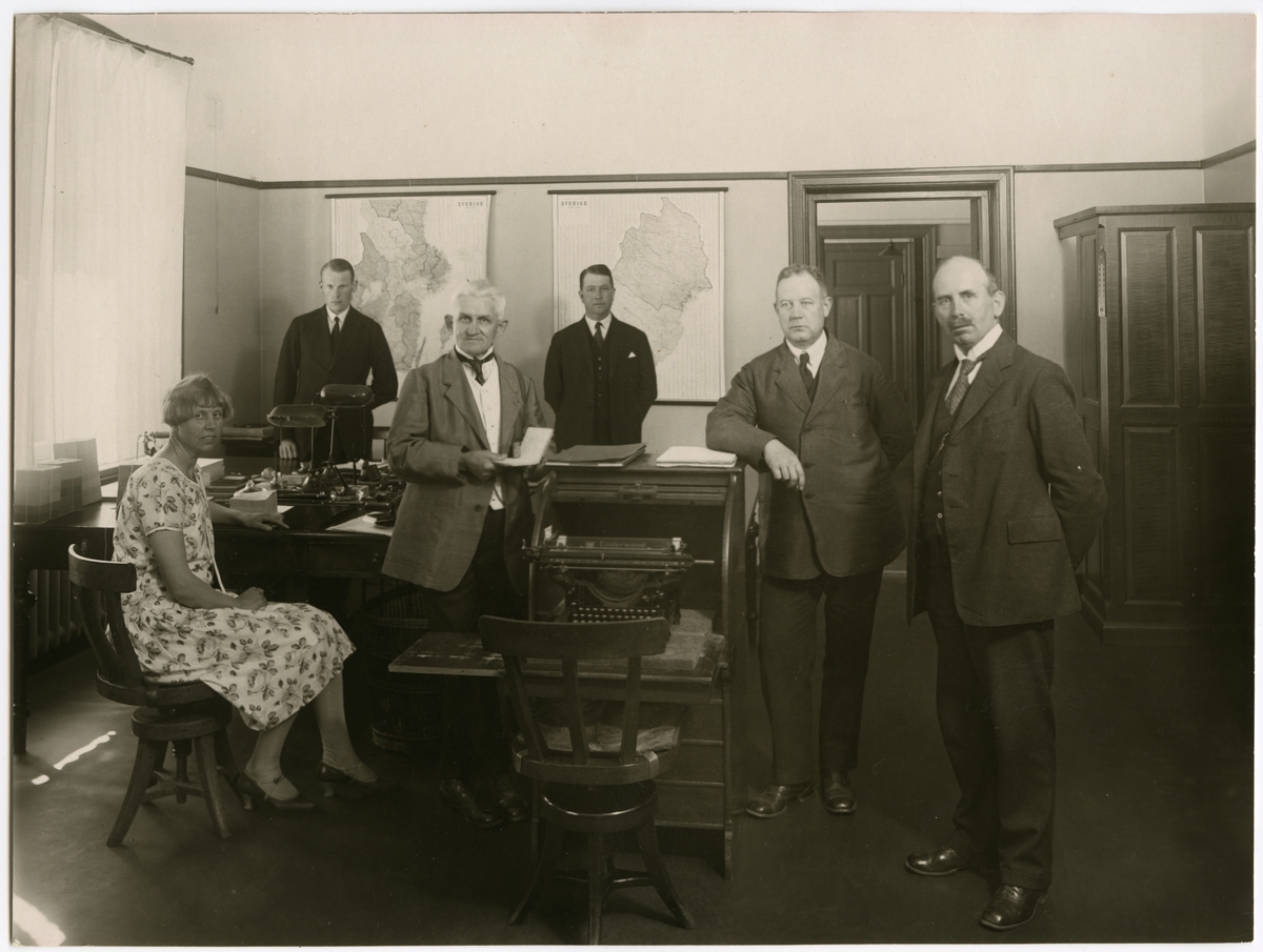 Personer från vänster Kontorsbiträde S. Järvall, Kontorist N. Holmer, Bokhållare B. Svensson, Kontorist G. Jakobsson, Kontorsskrivare Kl Lindqvist