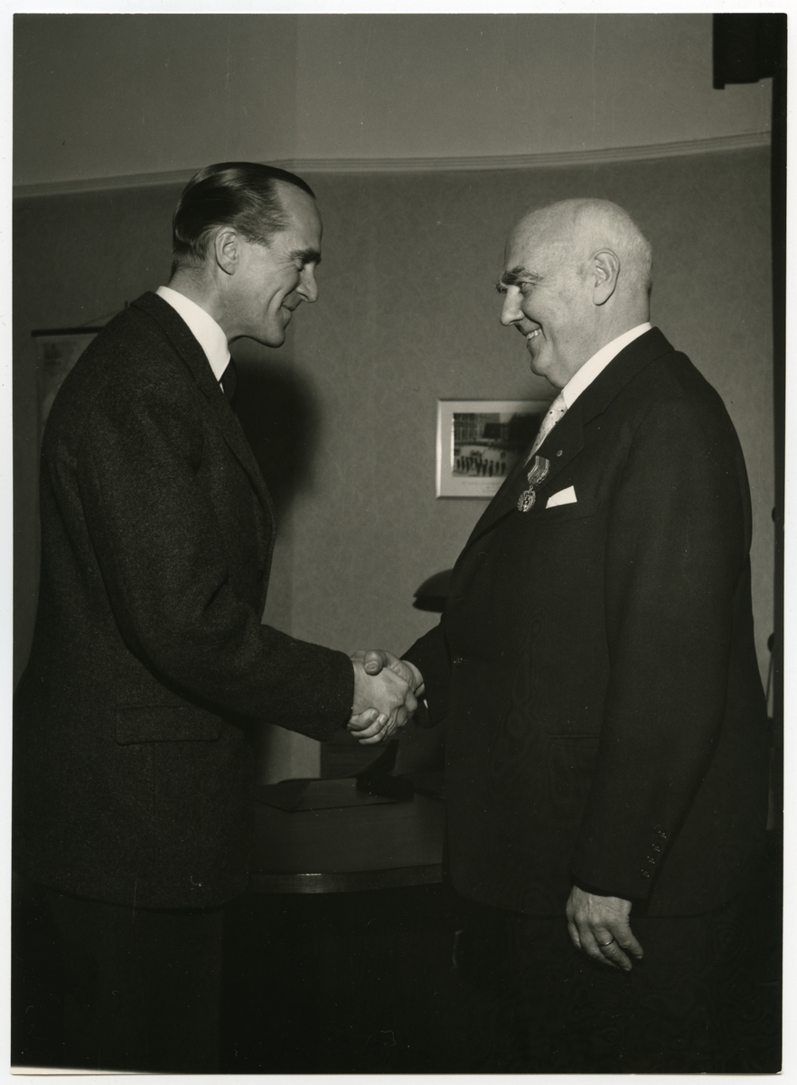 Distriktschef R Markland Malmö avtackas i plenisalen och på Försvarsbyrån, Stockholm 1956 12 28.