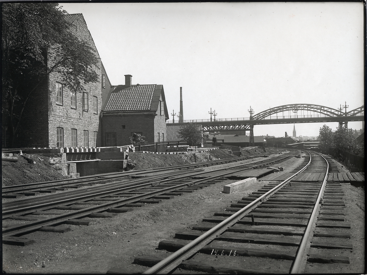 Karlberg. Höjning av huvudspåren över vägporterna vid Rörstrand. S:t Eriksbron i bakgrunden. Atlasområdet till vänster bortom bron, Rörstrandsområdet hitom bron till vänster i bild.