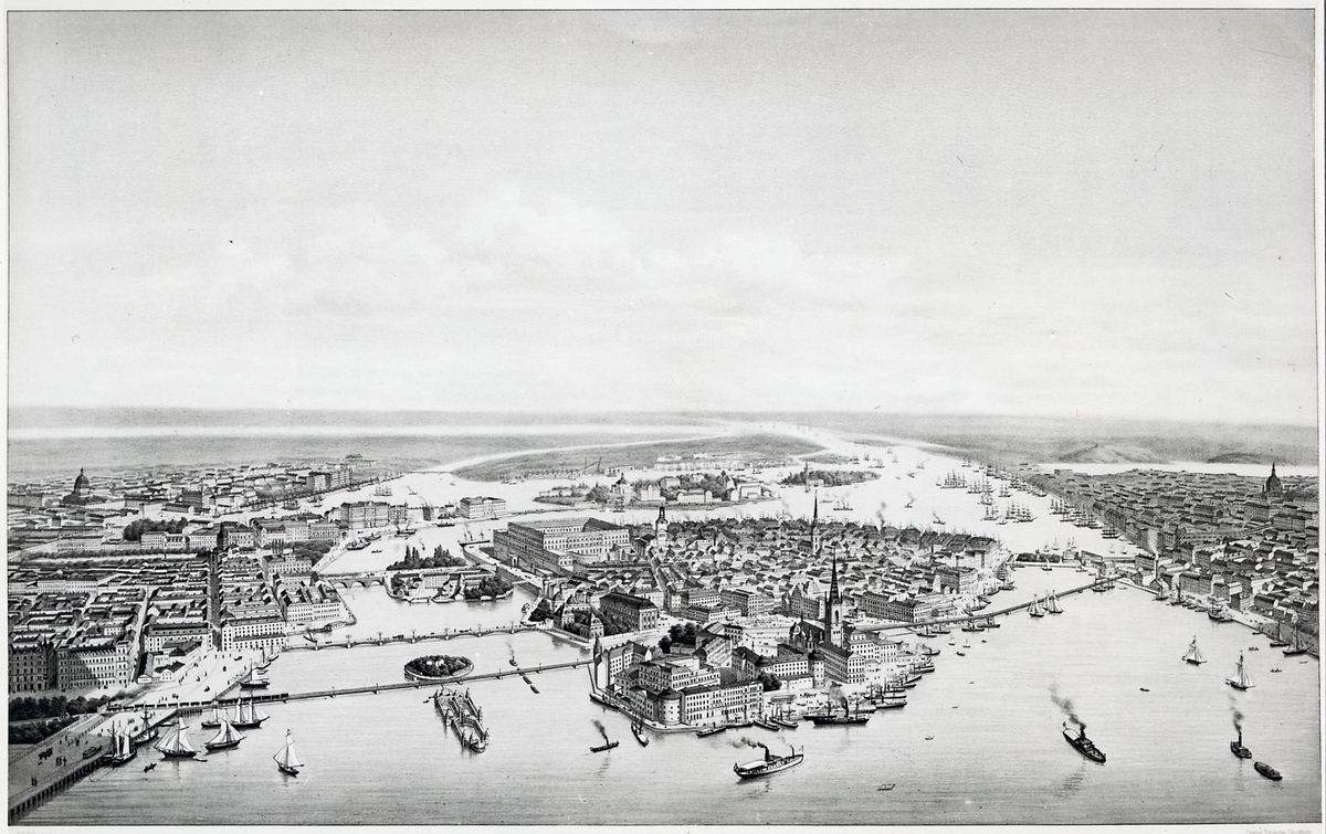 Titel: Rundmålning över Stockholm. Färgliografi efter Otto August Mankell.