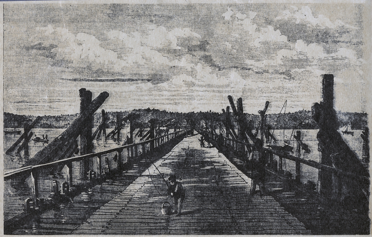 Lidingöbron 2700 fot lång. Återställd efter stormen 1858. Teckning av Otto August Mankell. Ny illustrerad tidning den 16 september 1871.