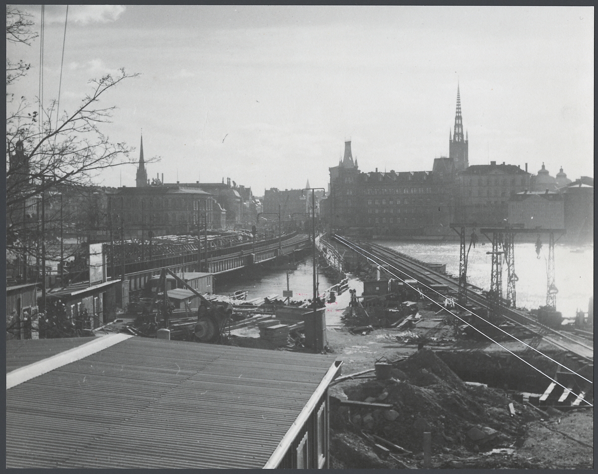 Stockholm Centralstation. Byggnadsarbete på nya bron över Riddarfjärden. Sträckan mellan Stockholm C och Riddarholmen.
