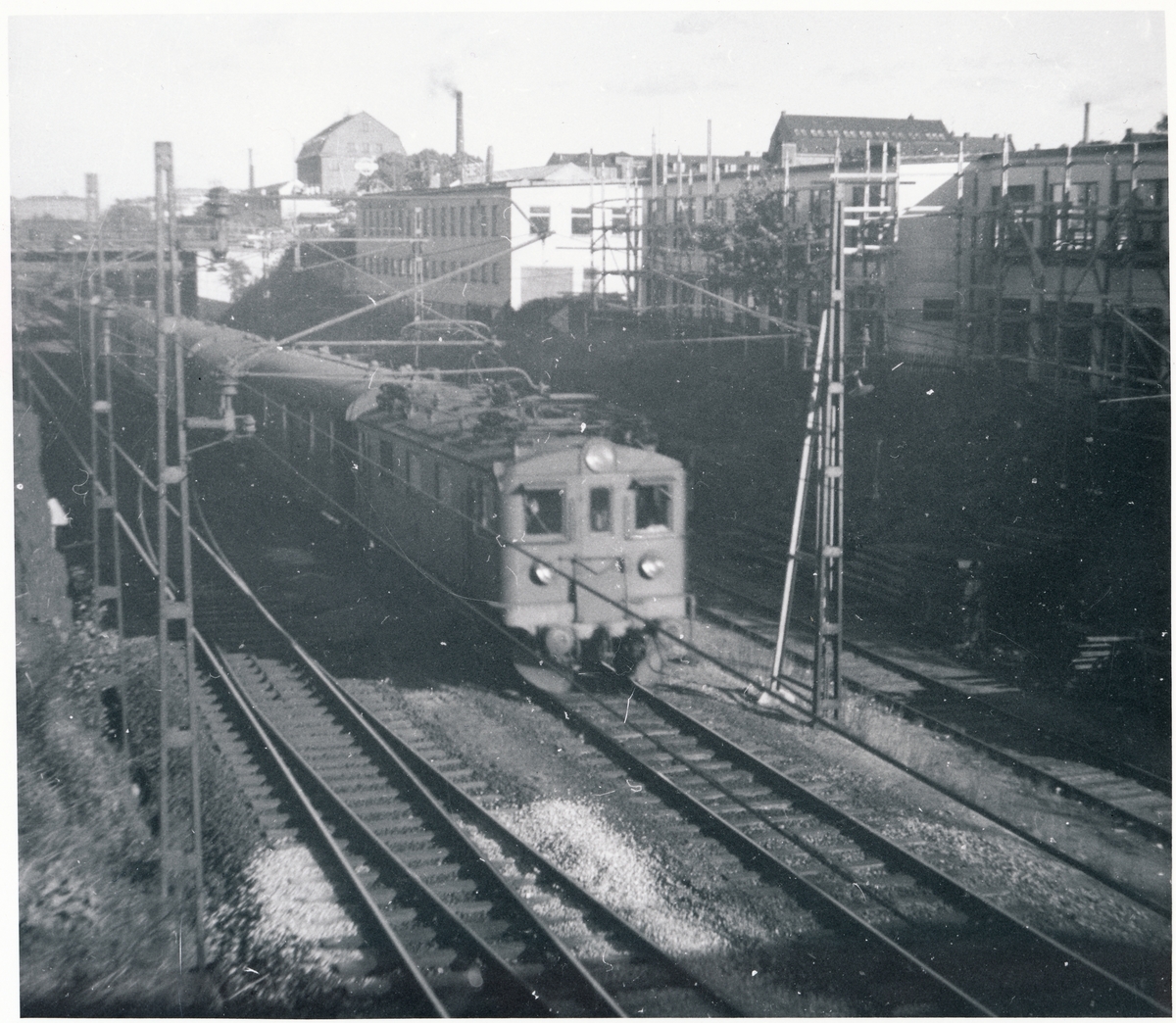 Stockholms södra station. D-loks draget persontåg söderut strax efter bron vid Ringvägen.