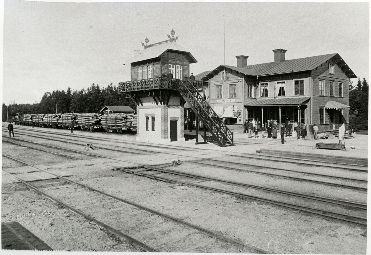 Titel: Godsvagnar lastad med timmer. Personal på bangården.