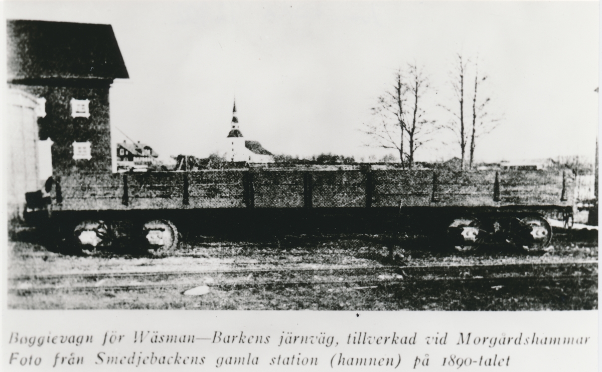 Boggivagn för Wäsman-Barkens järnväg, senare Smedjebackens Järnväg, SmbJ, vid Smedjebackens gamla järnvägsstation. Den användes bland annat till "lustresor" med plankor på tvären för passagerarna.